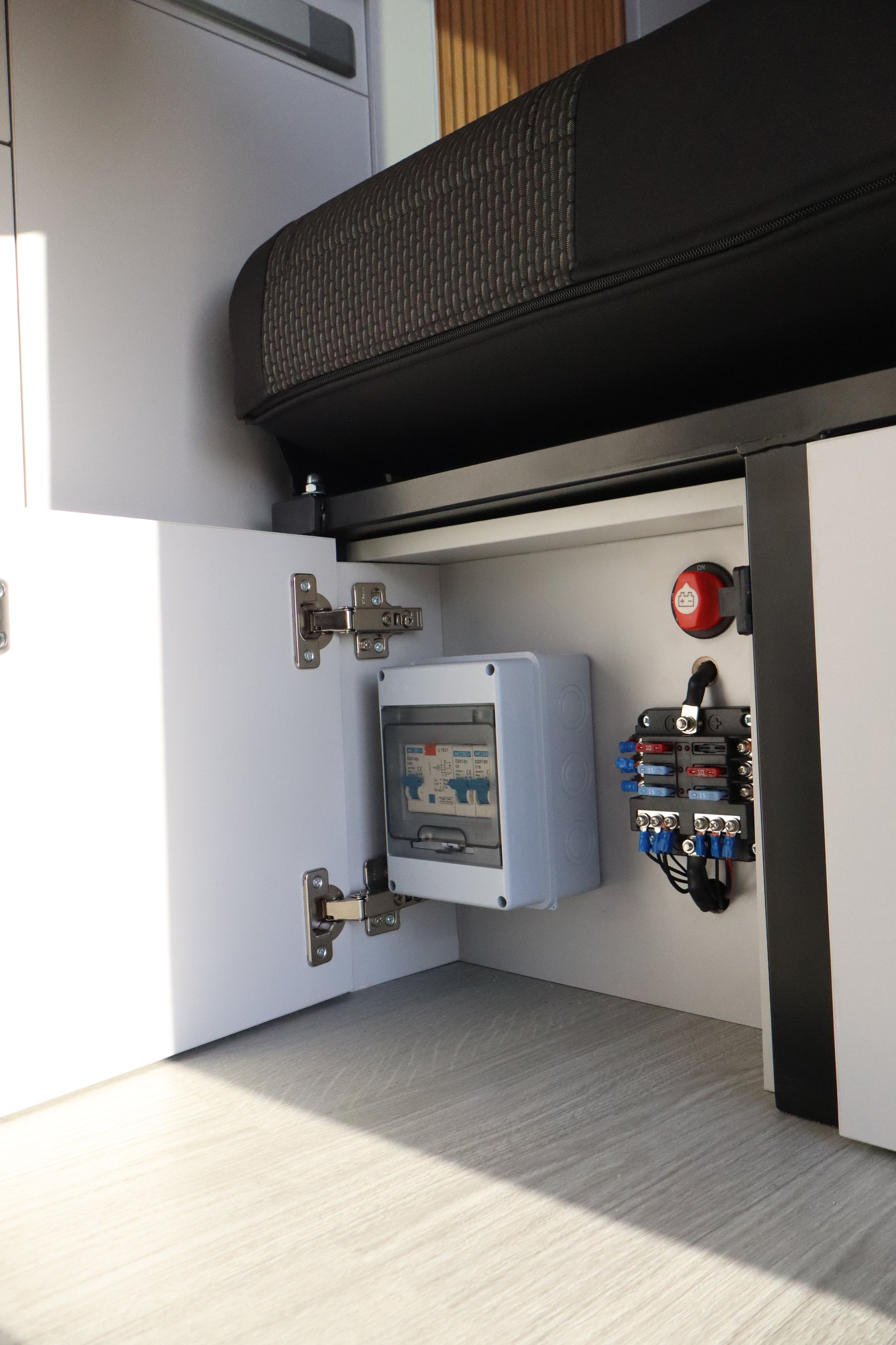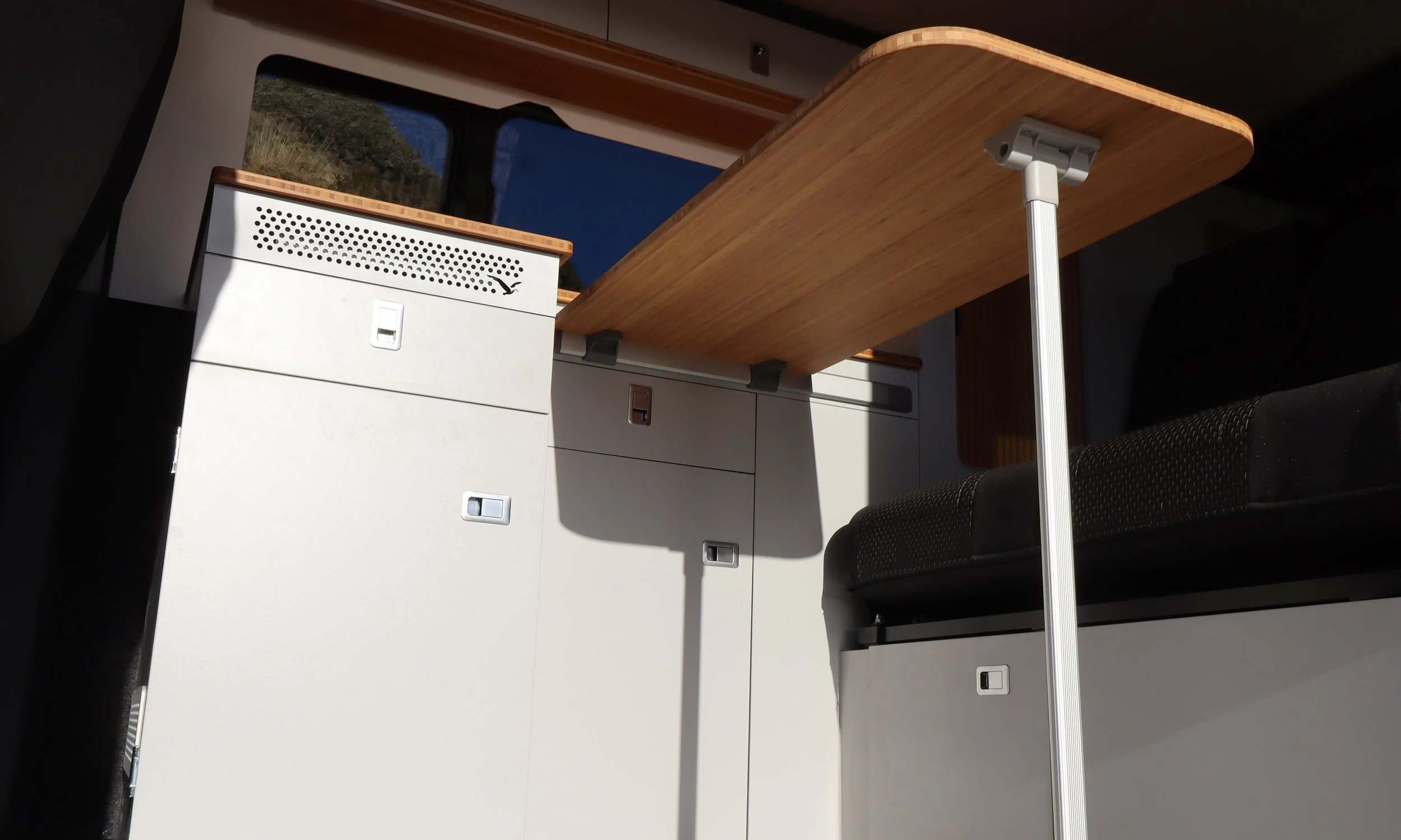 Thoughtfully designed storage throughout the van keeps everything organised without compromising living space. Overhead lockers provide easy-access storage for everyday essentials, while generous under-bed storage is ideal for larger items such as outdoor gear, chairs, or luggage. Additional storage within the rear door area makes the most of every available space, ensuring the Drift remains practical, uncluttered, and ready for life on the road.